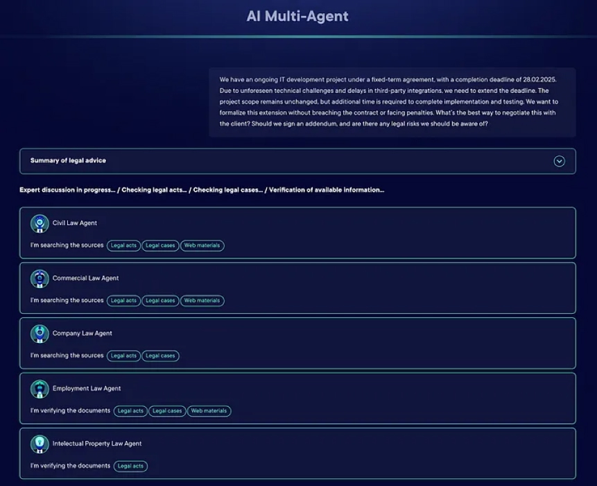 - Agents seamlessly collaborate through structured communication, exchanging data, drafts, and legal references.